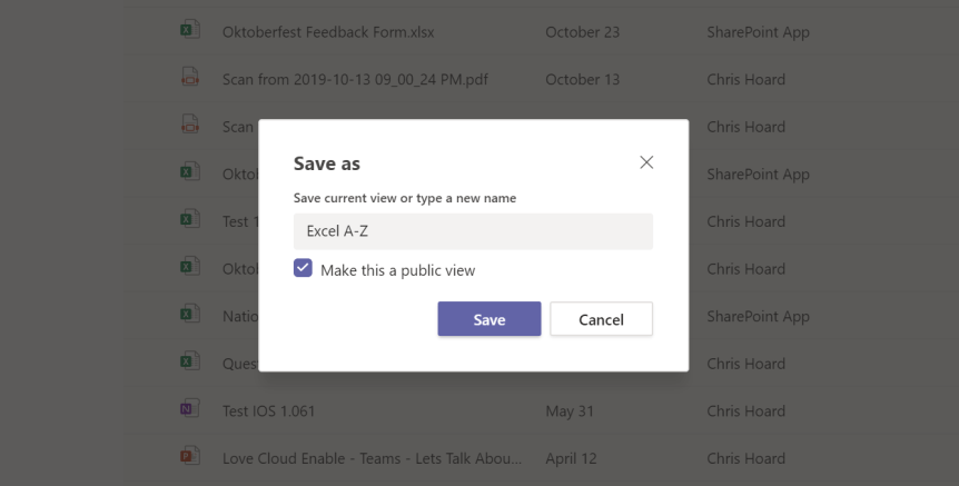 We started out examining the new rich file experience which has come to Teams (Full Blog here) by looking at pinning and unpinning files. Today, I am going to tackle adding a custom view to a Team. A custom view may be something the team, or a member of the team needs such as only seeing excels in an A-Z format. Custom views make it easier for users to arrange, search and use files in a way that makes sense to them. The new file experience gives us the option to create many custom views, both public (for the team) and private (for the individual) and in the initial stage of the Teams lifecycle, it is a great to consider this. It is also great that they apply across all channels in a Team, so it’s not making this task too granular or repetitive.
