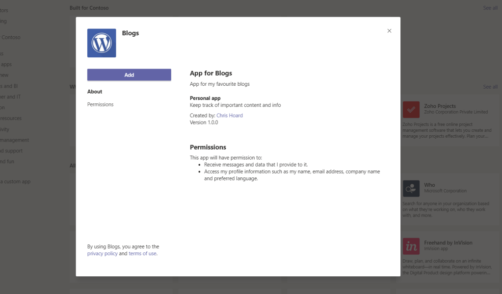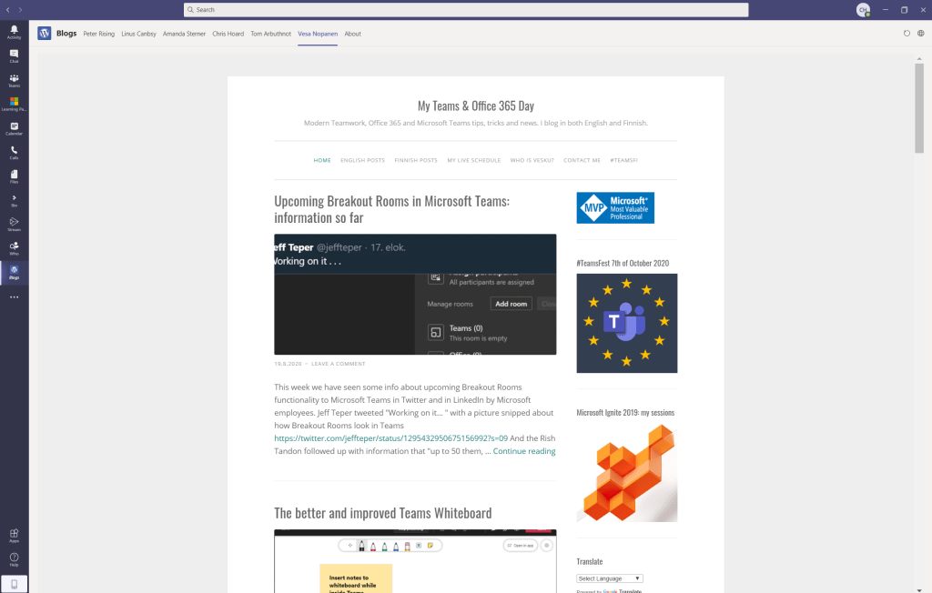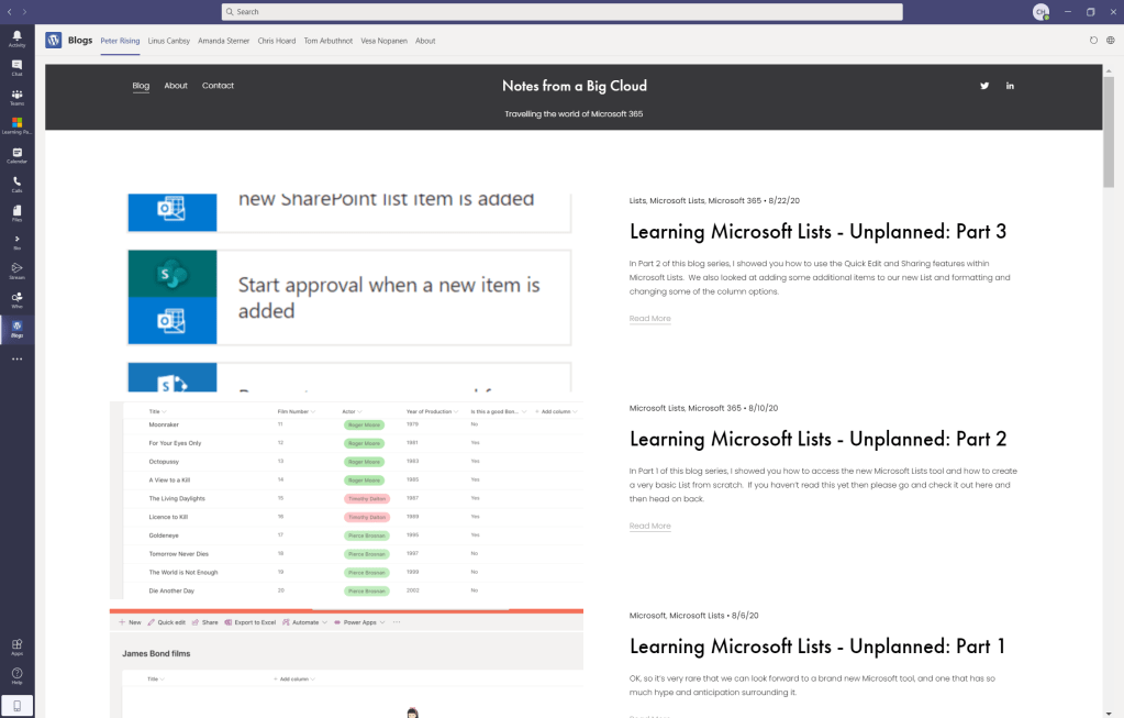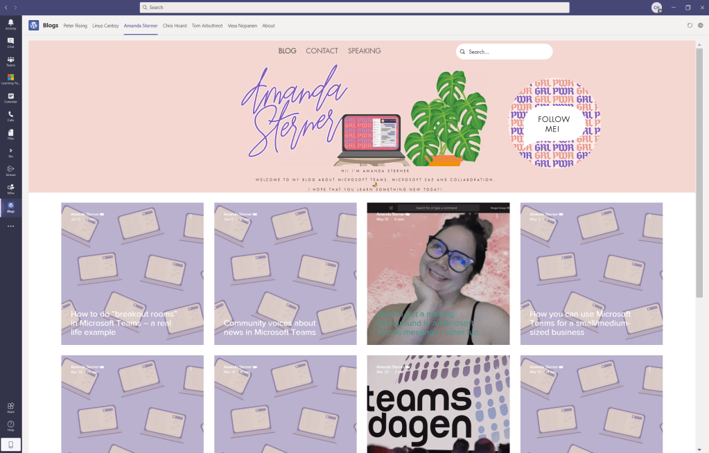 This is a really simple way to bring blogs together in an accessible way and surface them all into teams for personal consumption. Since more of my time is spent in Teams this saves me having to use a browser or switching context. It also means at a single click I am in accessing the content I want to read about before a meeting, or jumping on a call all within the same app. However, there is a few things I would like to see and you will probably hit upon if you attempt doing this. First, it doesn’t appear that you can access Microsoft sites in personal tabs in custom apps. This isn’t an issue per se as most personal blogs are housed on WordPress, or Medium which all seem to work from my testing. It is still a limitation though because it would be awesome to pipe sites like the Microsoft Teams blog into it. Secondly, you can’t reorder the tabs in the app manifest which means you have to be conscious of the order you add them. For me personally, I don’t really care so much however others will who like ordering so in that case you add them last to first if doing them alphabetically.