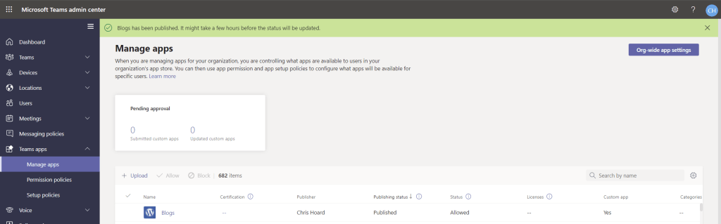 7.) Change the publishing status dropdown to Publish and then select Publish on the pop up. The publishing status of the app is changed to published and the status of the app is changed to allowed. The app can then be configured according to app setup and permission policies