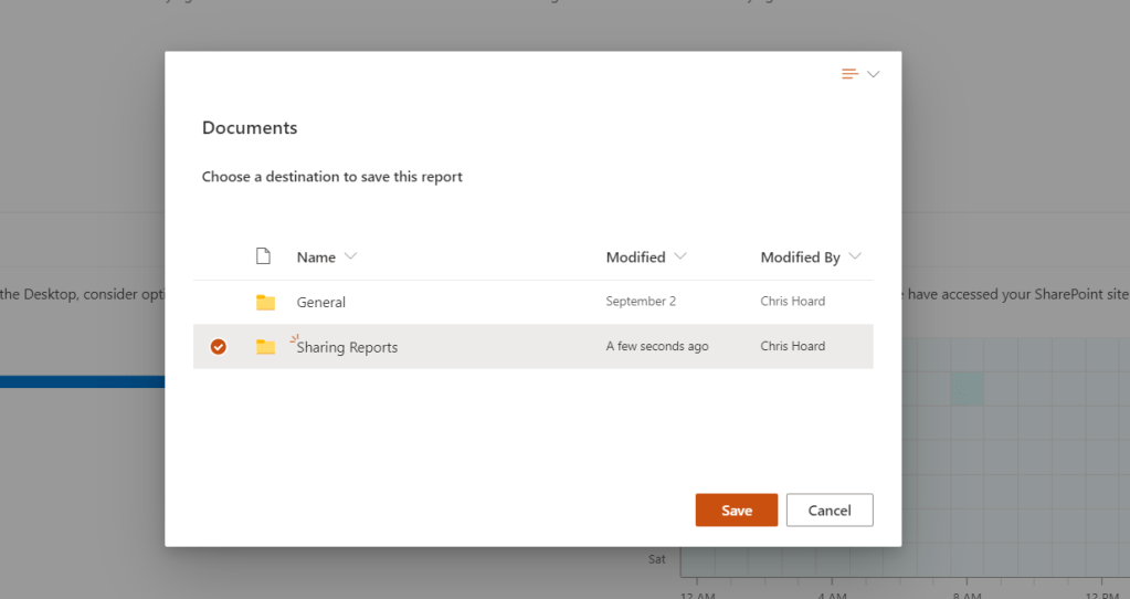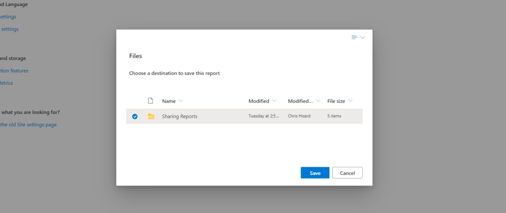 3.) Select a folder to put the sharing reports. Select General or New to add one. Once done, select Save. Note: the General folder here is the general channel in an associated Team. This may not be the best place to house such a report so it’s recommended to either save to general and move the report to a private channel via the move function in Teams Files or create a new folder which will be created in the documents of the SharePoint site but not create an associated channel in Teams