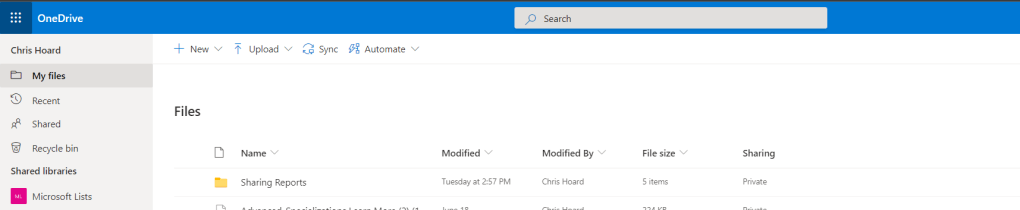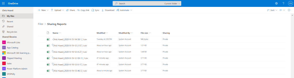 6.) Return to your OneDrive files, select the folder you put the report and then select the sharing report