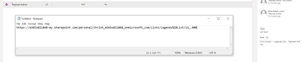 As a user, can you then correlate this resource path for a List Item to an actual List Item given the resource path doesn’t show in an actual list? Well, yes you actually can by using the Web experience, selecting the List, then the List Item, select Details then More Details and copy out the direct link onto a notepad which will show you the same Resource Path URL that you saw in the sharing report