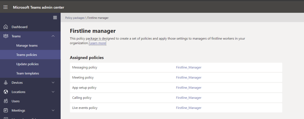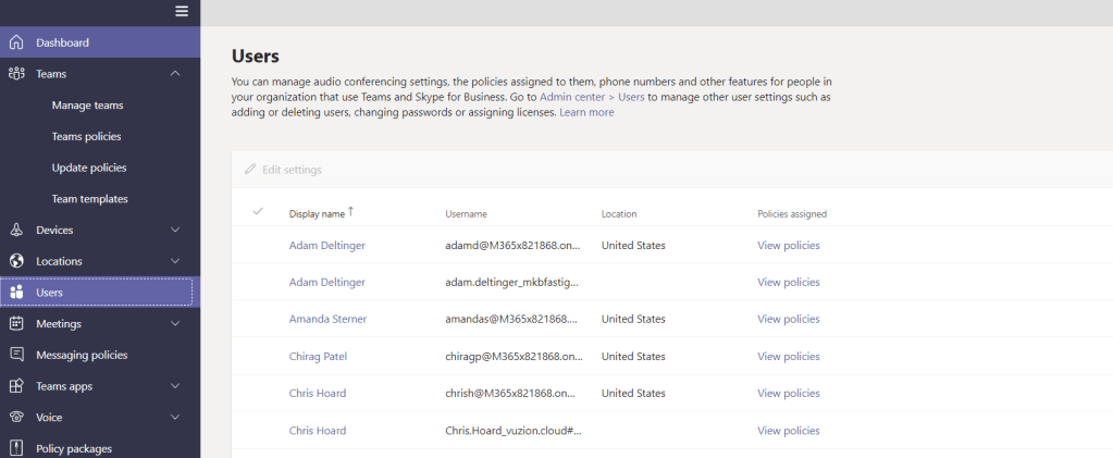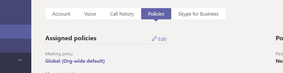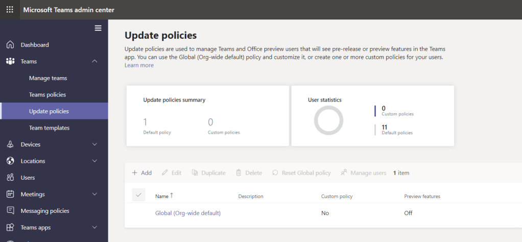 3.) In the Teams admin Centre, select Teams and then Update Policies and then select Global (Org Wide Policy). As you can see by the policy it is turned to off by default