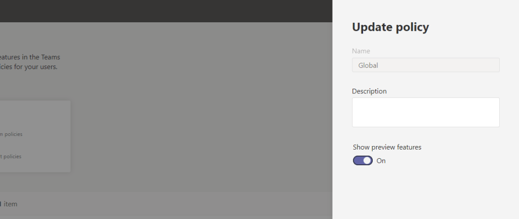 Before users can turn on public preview in their Teams Desktop clients, it needs to be enabled per a policy in the Teams admin centre. Doing this in the global org wide policy will do this for all users unless you decide to create a custom policy for specific users (see next section)