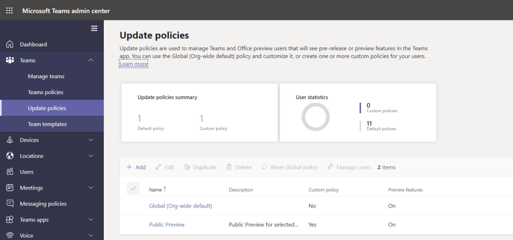 1.) In the Teams admin centre, within Update policies, select Add