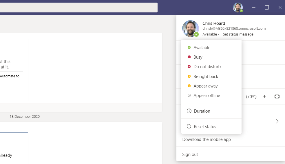 This blog will look at how presence can be hidden both inside and outside the organisation. I won’t go into the ethics or the idea of being a presence liar. However, when I encounter someone who wishes to hide presence I typically find they fall into one of three buckets. The first are those who have privacy concerns from a personal or compliance perspective. These typically want to restrict or turn off presence completely. Secondly, there are those whose work needs a lot of focus time and would rather be shown as being not around as opposed to being interrupted. Third, there are those who want to enhance presence and better articulate their working status and so want to turn it off until it has the functionality it needs.