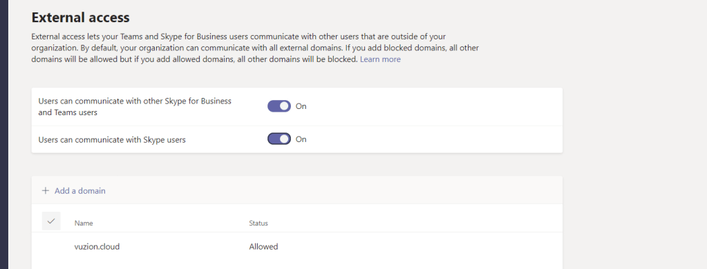 4.) Turn external access off if you do not intend to work with other organisations and they will not be able to see your users presence status or be able to communicate with your users via Teams, Skype for Business or Skype Consumer. If you only intend to work with specific organisations add their domains to your allow list and only those specific organisations will see your users presence because only those organisations will be able to communicate with your users. All other external organisations will not be able to see your users presence or communicate with your users