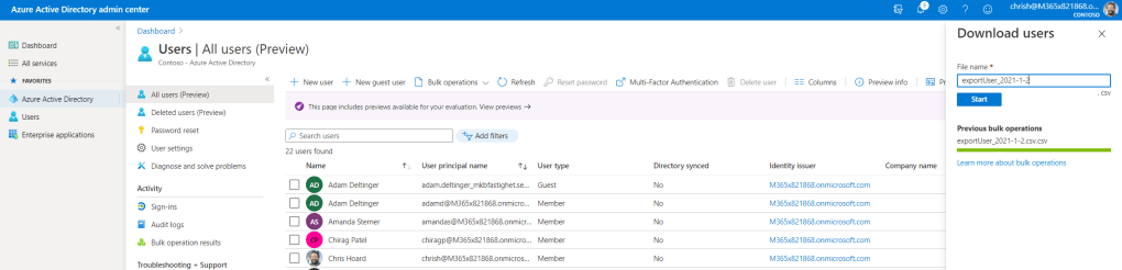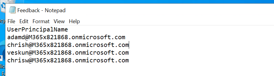 7.) However, it may take a long time to do this for the users we want, and the Teams Feedback Policy is not currently supported via batch or via group policy assignment so if you want to apply it to many users, or all users in your organisation the easiest way would probably be via CSV. Create a CSV file called ‘feedback’ with the first column heading of UserPrincpalName as shown below and deposit this in C: either on the local or virtual machine – wherever you are holding your powershell session. This process is made significantly easier by downloading a copy of users via CSV in Azure AD (third screenshot) and cleaning it up