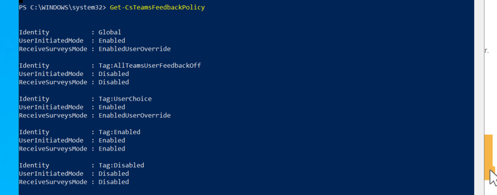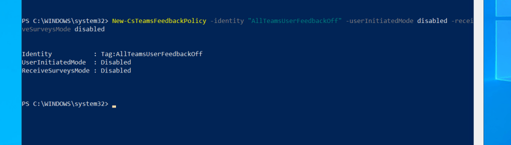 New-CsTeamsFeedbackPolicy -identity “AllTeamsUserFeedbackOff” -userInitiatedMode disabled -receiveSurveysMode disabled