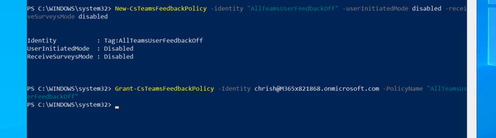 Grant-CsTeamsFeedbackPolicy -Identity chrish@M365x821868.onmicrosoft.com -PolicyName “AllTeamsUserFeedbackOff”