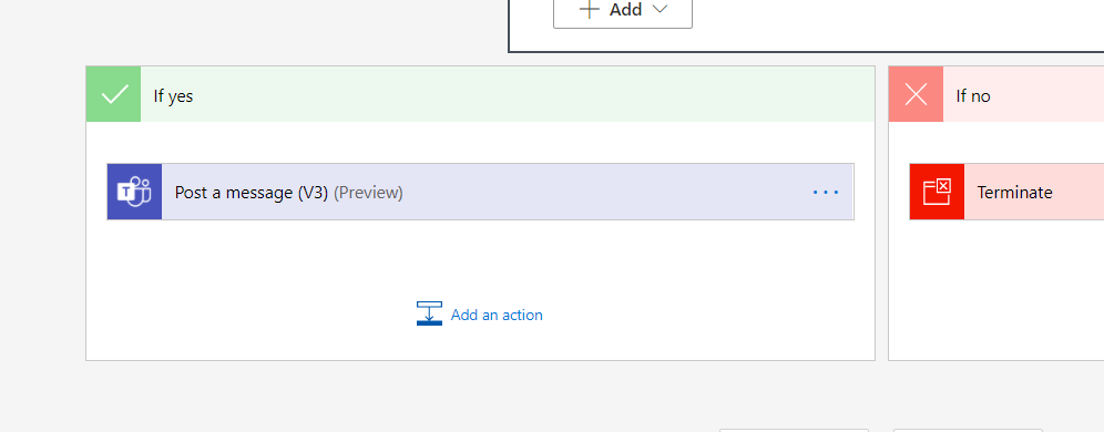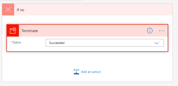 5.) Next we move onto the If no box. This determines what happens if the course wasn’t rated a 5 by the attendee who has completed the form. Add an Action, search for and select a Terminate action with a status of succeeded. In other words the flow will finish with no further action will be taken if the attendee rated the course 1,2,3 or 4