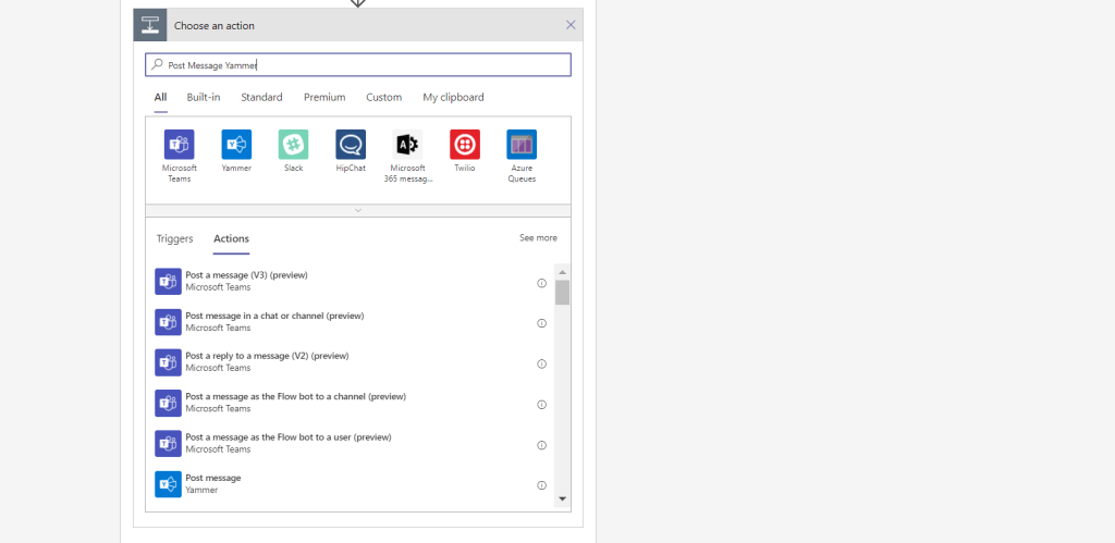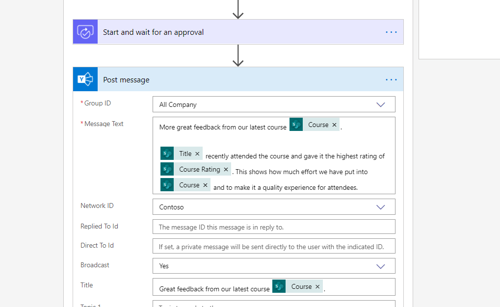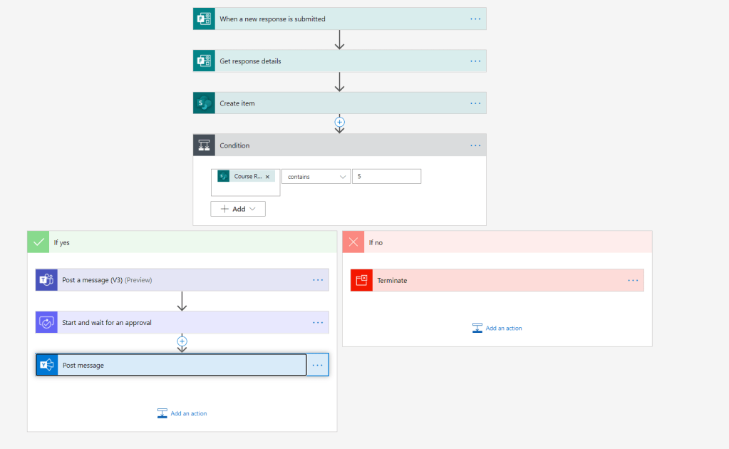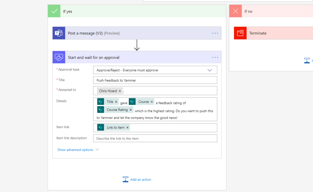 9.) However, I am going to go further. I am going to add an approval process whereby if the Team owner who manages all the courses approves then the great news is going to be pushed out to the rest of the business via Yammer. So, back into the flow and after the Post a Message V3 action select Add an Action