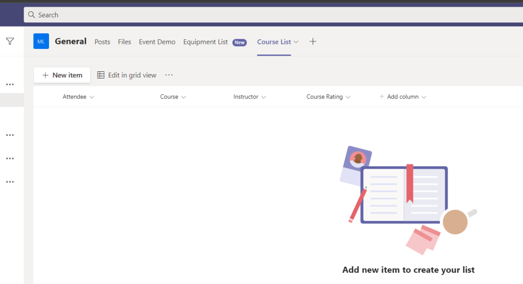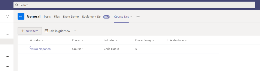 2.) The second step is to build a List within Teams whose columns correspond to the questions in the form. This has been done simply with four columns corresponding to 4 questions, all the columns single lines of text. Of course, Forms and Lists can be made up with many more questions and columns, and with more questions and columns there are the more opportunities in the future in terms of the flow. This is just a small example for today