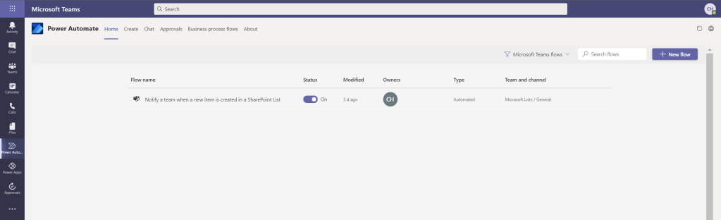 3.) So our Form and our List – the foundational components – are ready to go. Search for and Open Power Automate. On the home tab select New Flow in the top right