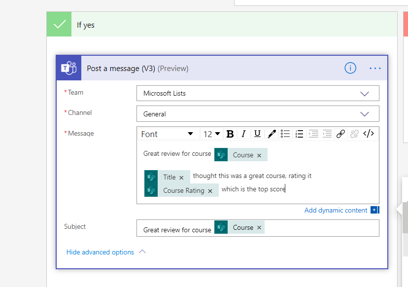 8.) Add the Team, Channel and body of the message. Add a subject line to make it stand out. This is a congratulations message to the Team. If we stopped the flow here then this would simply just give feedback to the Team