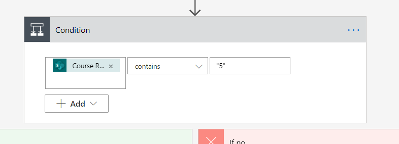 4.) Let’s start with the condition box. This example will use a condition of the course rating of a new List item and base it upon the highest rating. In other words, what happens after will depend upon how the attendee scored the course and whether the course was rated 5 or not. Note, it is very important to add “” around the 5 otherwise the flow may not work