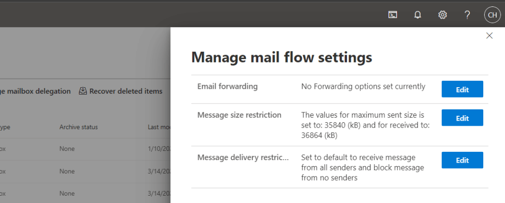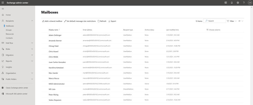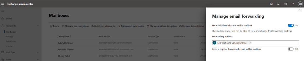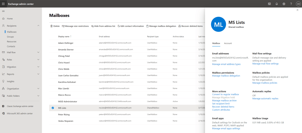 13.) Now select Mailboxes and then Add a Shared Mailbox. Here one has been created called MS Lists. Select the shared mailbox to open the flyout