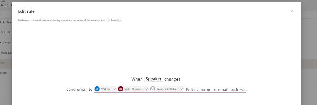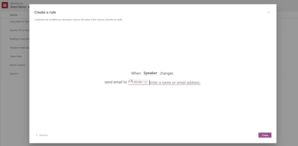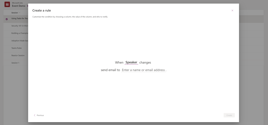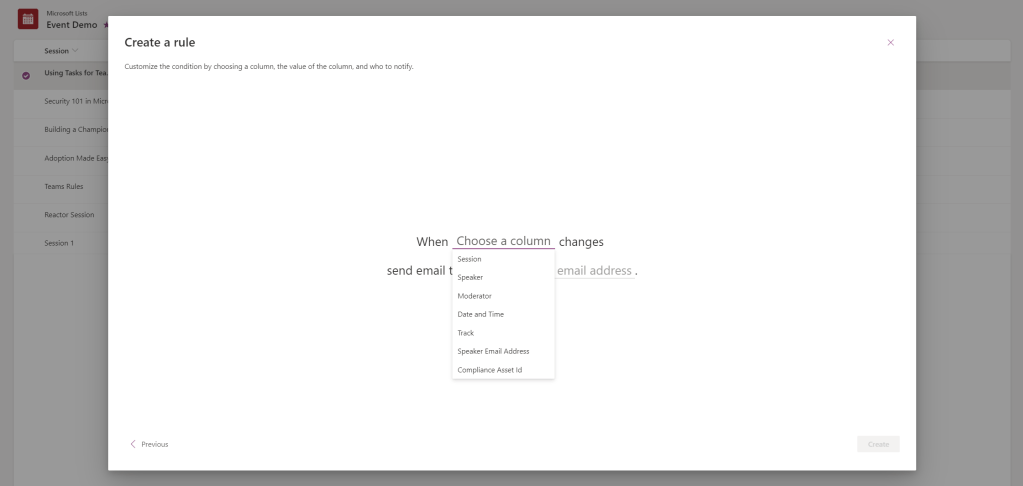 5.) Now complete all the elements of the sentence using dropdowns or typing in the value to complete the rule. The requirement is to notify the team if any speaker changes for any session, therefore speaker (the column) is chosen from the drop down