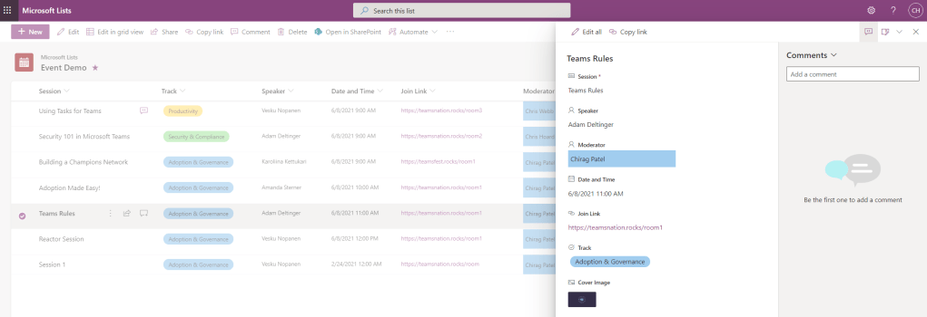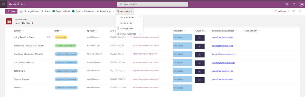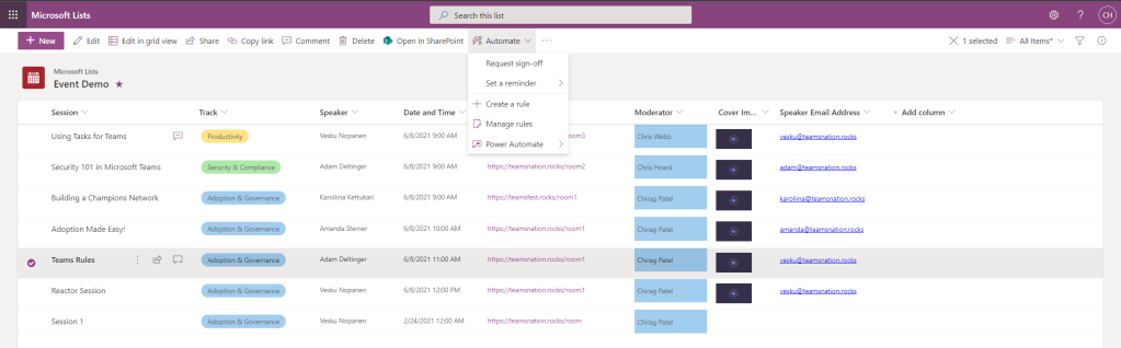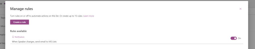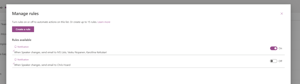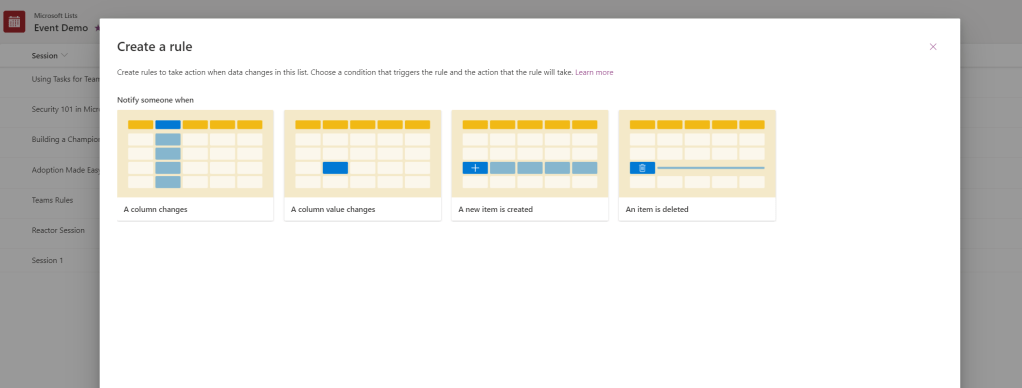 It feels good to be back on a somewhat even keel. Winter has been absolutely crazy – and after the Microsoft Teams Winter Tour and Ignite I had to take a short break to play what I call the containment game. You know the one. Batting everything out whilst simultaneously closing everything down. It’s stopping that accumulation of work from getting out of control. I am happy to say that’s now done. I won. It’s back to business as usual. So what should we talk about first? There is a lot of things given that Ignite is now over – and if I were others maybe I would go for the latest and greatest, yet having wanted to discuss it since it’s recent release and having had no bandwidth to do so I have settled on List Rules and how we can notify the Team of changes to the list. Something straightforward and doesn’t take long to write home about. So Rules. Rules are defined by Microsoft as having the purpose of ‘automate [ing] tasks such as sending someone a notification when data changes in the list’. In other words, they are very likely replacements for Alerts which have been around a long time and are legacy functionality stretching back to classic SPO and SPO Lists. Now, this blog won’t cover every possible scenario for a rule. There’s no point – it’s super simple and as you go through this blog you’ll see how easy it is to implement rules. What I am more interested in is notifying the team of changes rather than individuals: either in Teams or via email. What’s that? This can be done by Power Automate and we could create a flow and do it that way. Absolutely. Yet this would suggest whoever is implementing it knew how to do that and had the time and inclination to do that. For me, a lot of what I hear is people want to just do things there, on the List. So Rules for simplicity, Power Automate for anything more