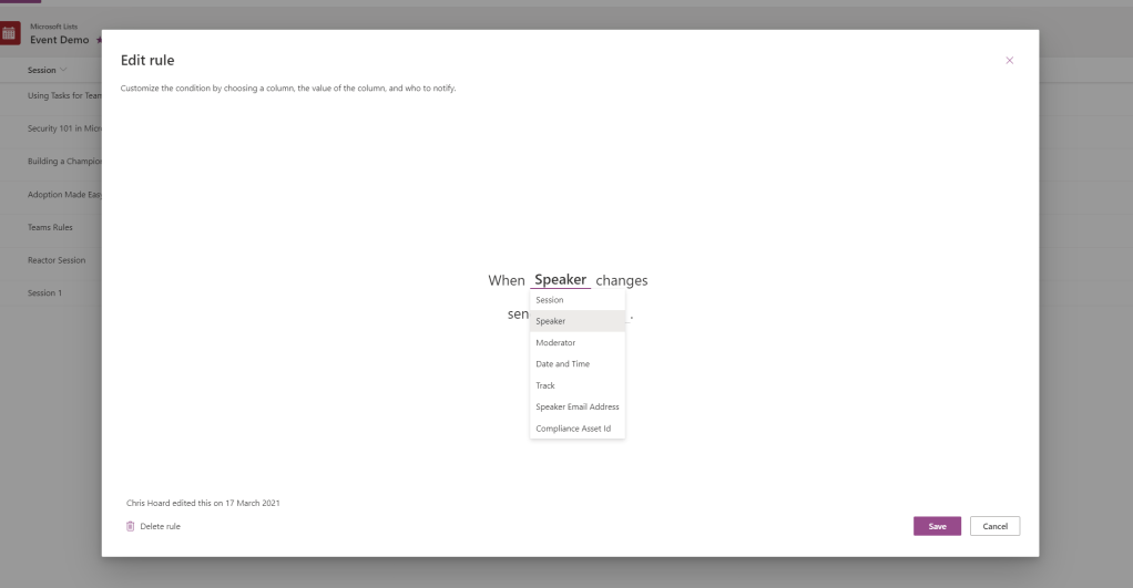 The List used within this blog is a List of Sessions at a Technical Event (see screenshot directly above). The requirement is for the team to be notified if a speaker changes on any session. The rule A column changes would fit this