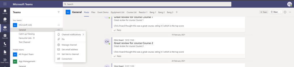 Or from the Lists mobile app, the end result is going to look like this with the notification from Lists posted into the Team channel. Note, this screenshot is from a different tenant as the test tenant I use is blocked from sending email with a 5.7.708 (common in test tenants to protect against spamming).
