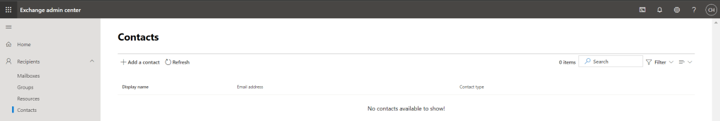 9.) In the Microsoft Exchange admin centre, Select Recipients, then select Contacts