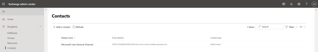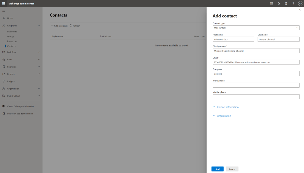 11.) Add a Mail Contact and in the contact details add the Teams Channel Email Address. Once done, select Add