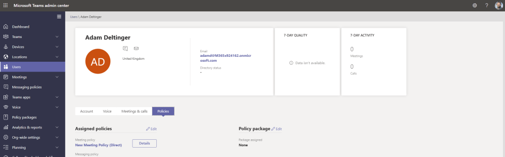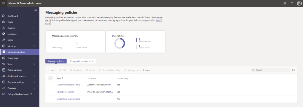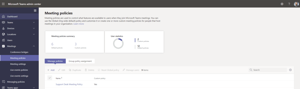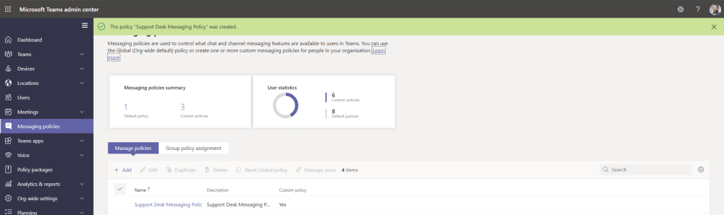 Before we create our custom policy package, we need to create the policies. Custom policy packages can only contain custom policies. In other words, they cannot contain the global org wide default policies applied when users are first added to Teams. Let’s create one now