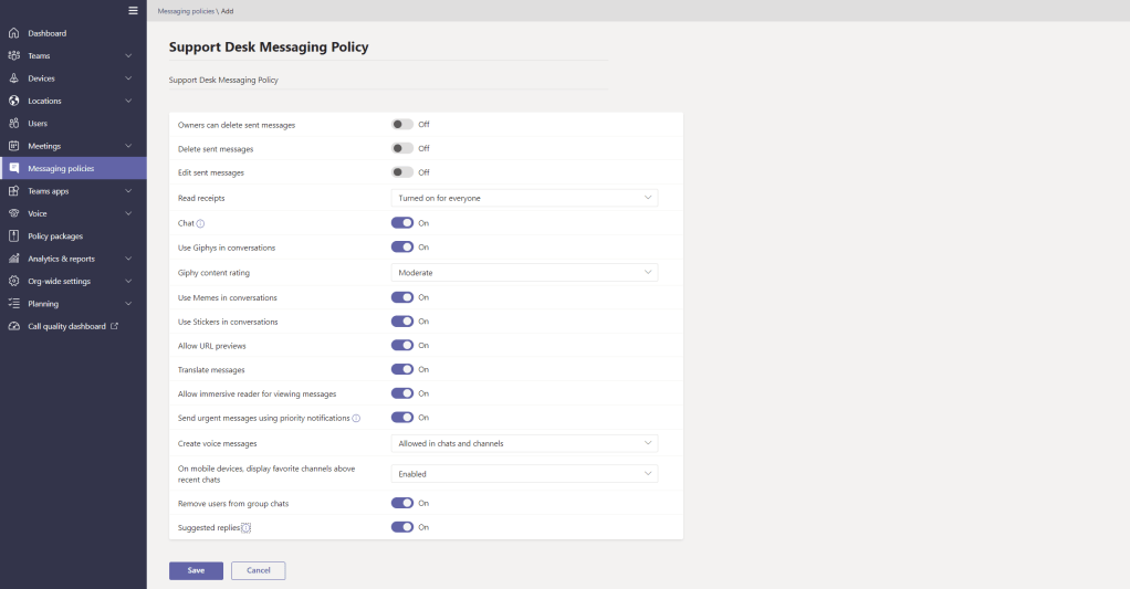 5.) Create your custom policy, configure the settings and give it a name and description. For this example the policy has been called Support Desk Messaging Policy. Once complete select Save