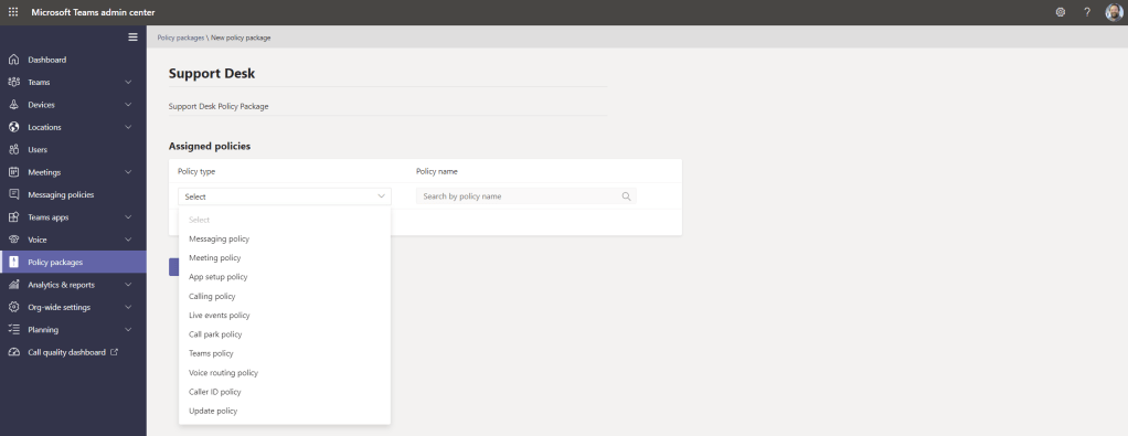 3.) Give the policy package a name, a description (here defined as Support Desk – the role which the package is designed for). Use the policy type dropdown and policy name search to add your policies and then select save