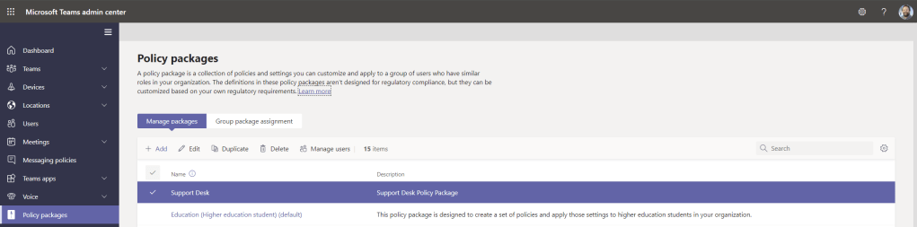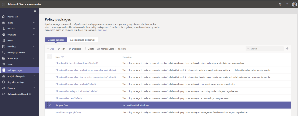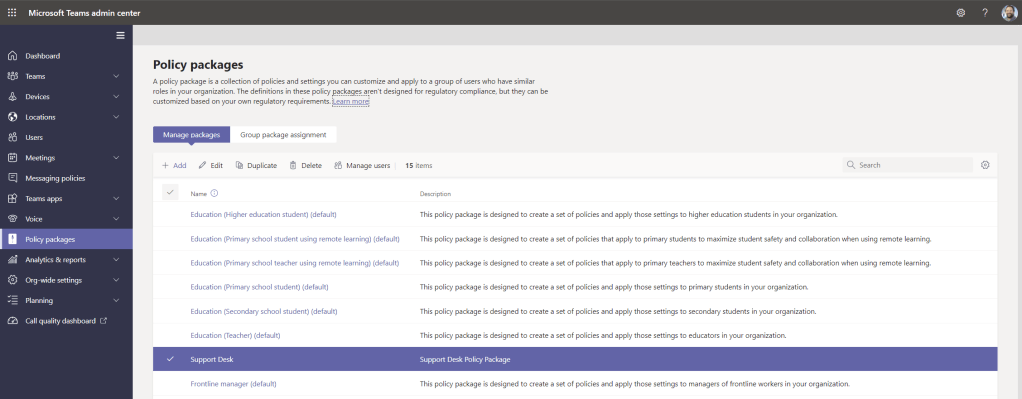 On the speaker circuit I occasionally talk about Policy Management in Microsoft Teams. It’s something I enjoy talking about too. Why? Because when it comes to Teams I believe having a good grasp of policy is necessary for shaping a good user experience. It’s important too from a security, compliance and governance perspective. Now like any talk this one’s evolved to account for a number of incremental adds. We’ve seen the introduction of update policies where you can add users into private preview to test out functionality in advance. We’ve seen template policies. We’ve seen the ability to use the TAC to manage meeting backgrounds within the meeting policy. And during all of these talks one of the things which has featured has been policy packages. Policy packages are defined as ‘a collection of predefined policies and policy settings that you can assign to users who have similar roles in your organization’. In other words, we assign a policy package to a teacher, or a student or a nurse or to a firstline worker – and that policy package contains a messaging policy, and a meeting policy, and a live events policy and so on and so forth. The benefit of the policy package – a container as it were similar to an access package in Azure AD – is that it makes it easy for administrators to standardise what users can do and how users can experience Teams based upon role. It can make it easier to assign multiple policies without getting too granular. An awesome functionality is that you can also use group policy with dynamic groups and assign the correct packages as users transition roles. Yet for all the virtues of packages, the big limitation has always been we couldn’t create custom policy packages. We’ve had a number of preconfigured ones by Microsoft – and that’s all well and good except we’ve needed to create packages for our own roles, our own organisations. Well now we can