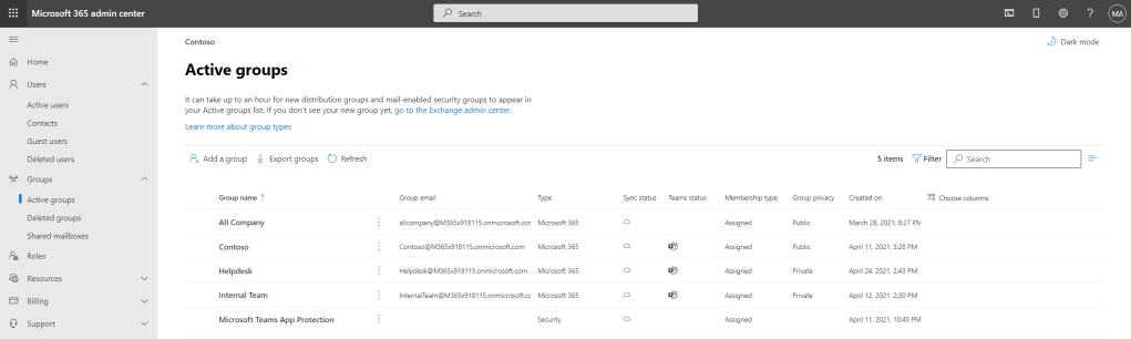 2.) As the call queue will be added to a Team which already has a Microsoft 365 Group, you do not have to create anything like a security group or a distribution list in the Microsoft 365 admin centre for the members who will be assigned to the call queue. As shown here, the Microsoft 365 group Helpdesk is already created after creating the team