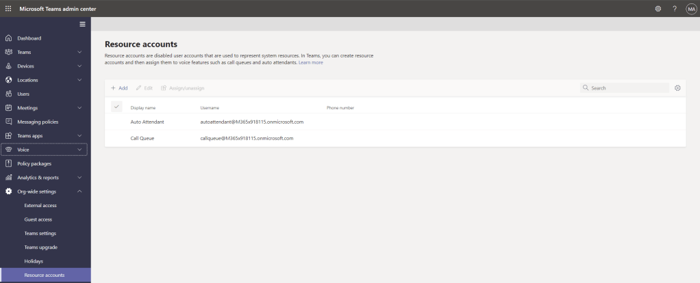 4.) In the Teams Admin Centre, add your Resource Accounts in the org-wide settings. Here shows a resource account for an Auto Attendant and one for the Call Queue which we will use