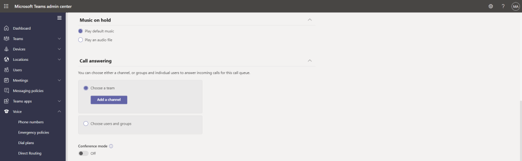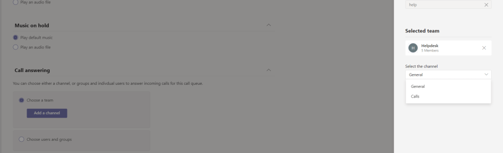 8.) We now get to the setting up collaborative calling under Call Answering. Traditionally we would choose users or a group. Now, we can choose a Team. Select Add a Channel