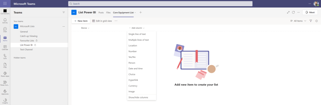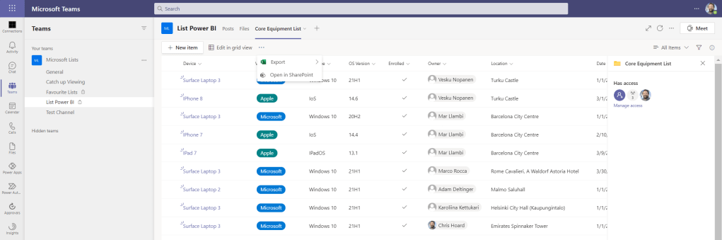 Before we can generate a Power BI Report, we need to add and populate the list. There are several ways to create the List in Microsoft Teams as outlined in this previous blog including from scratch, via excel, via an existing list or from a template. This list, in this fictitious example, is going to be a master list of all the company owned devices which have been issued to users within my organisation and I am going to build this from scratch