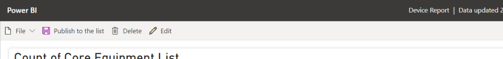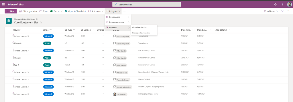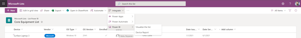 1.) Return to the list within the web app and select Integrate then Power BI then the list name (in this case Device Report)