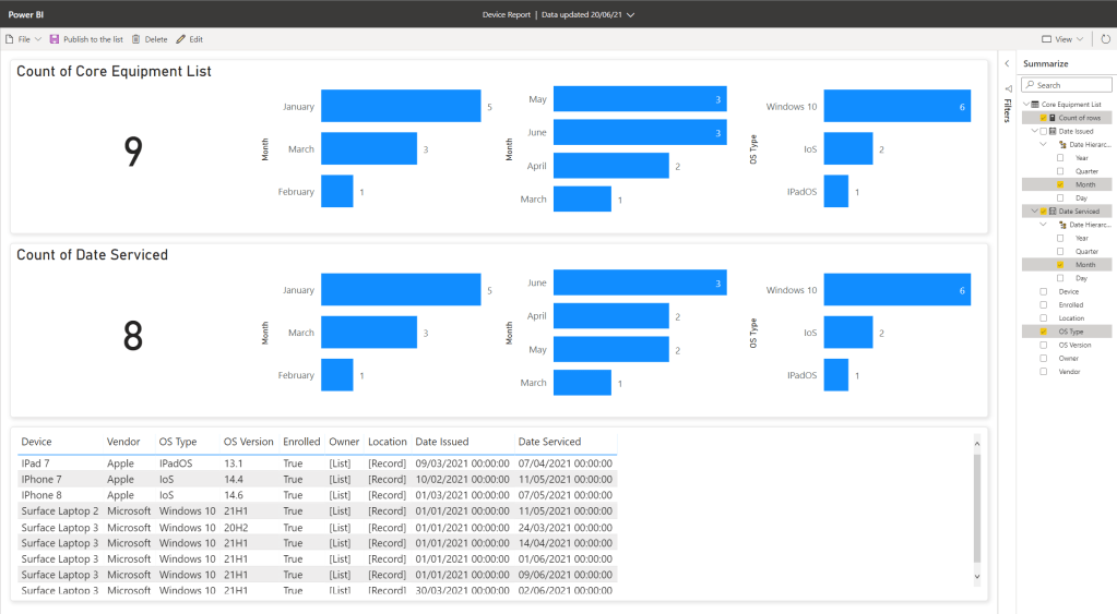 The Power BI Report is now published and should update regularly over time as list data is added. However, you may wish to return and tidy it up or amend a specific visualisation since – from this experience, the generated report does not use all data from all columns in the list.