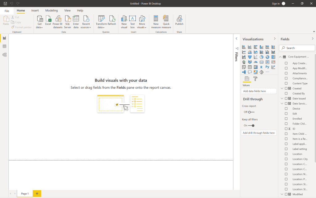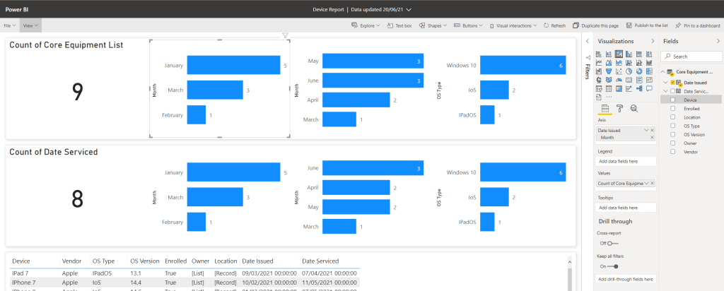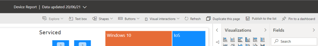 4.) The Summarise pane on the right is replaced by the Visualisations and Fields panes where you can amend the report and visualise what you want to see. As you can see below, after editing the second image looks a lot more coherent, uses all the fields of the data and presents a lot more information including device onboarding over time, device servicing over time, device proportion of estate, the number of devices enrolled into Intune, devices by vendor, % of devices both onboarded and enrolled, as well as breakdown of OS version which shows a need for update. The slicer down the bottom can be used to target specific devices