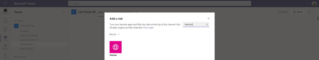 2.) In Teams, select the Team, then Channel then + (Add). Search for and select Website