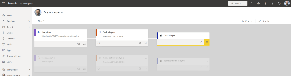 17.) In the Power BI Web App the report appears in the workspace. Viewing the Lineage will show that the report is connected to the list housed in SharePoint