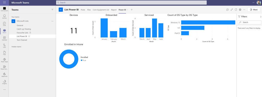 21.) The report is now open in the Power BI App in Microsoft Teams. Updates to the list in Teams or the lists web app will update the report