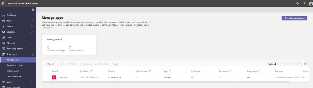 To better help make a decision which way you should go in terms of a simply disabling the app, or using an app permission policy, you can use the Apps Usage Report under the Usage Reports in the Admin Centre. If Freehand by InVision isn’t there at all – meaning being used in the last 90 days – you would probably be safe with disabling the app itself. If it is there you won’t be able to specifically see who is using the apps so you may need to reach out to Teams Owners to see if the app is installed