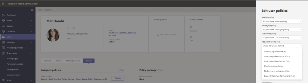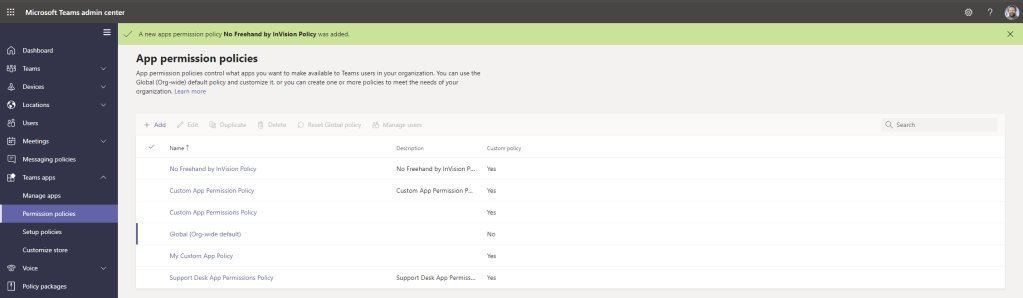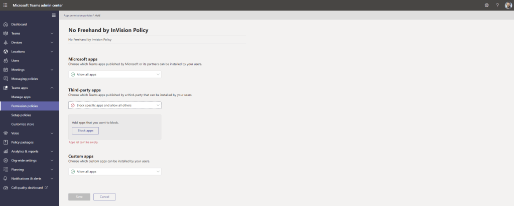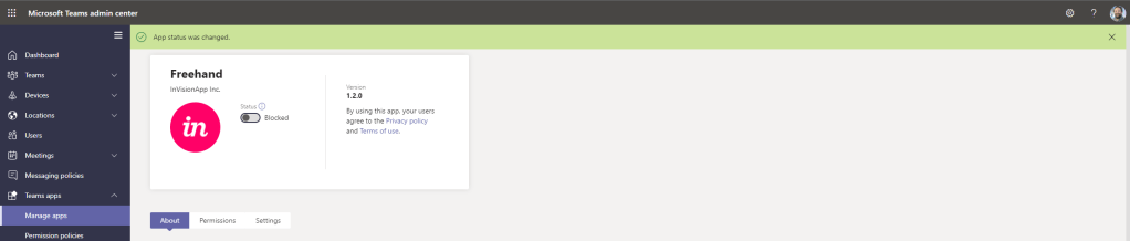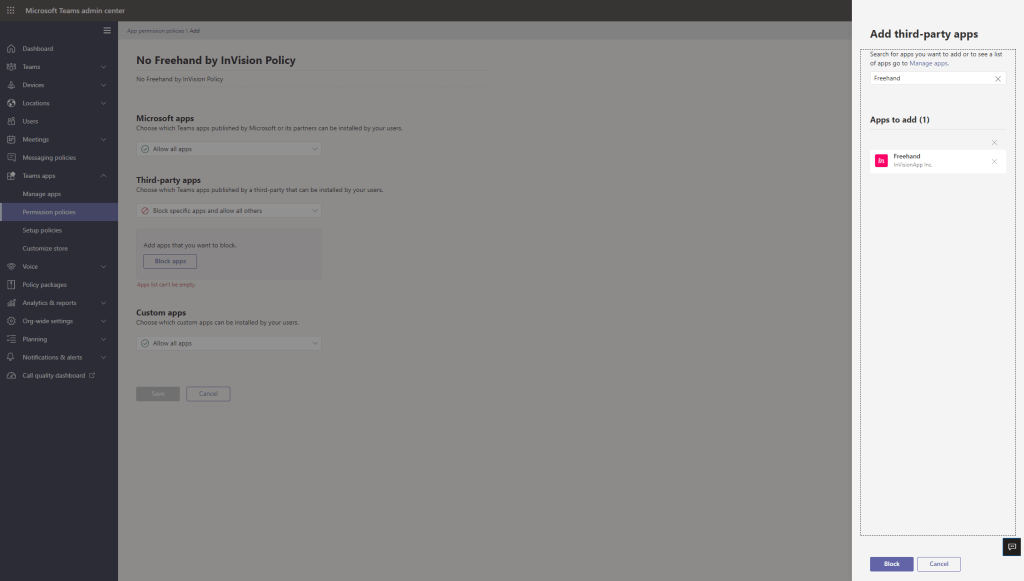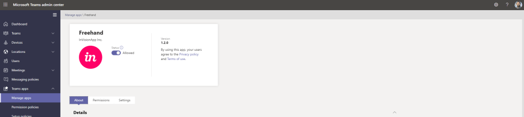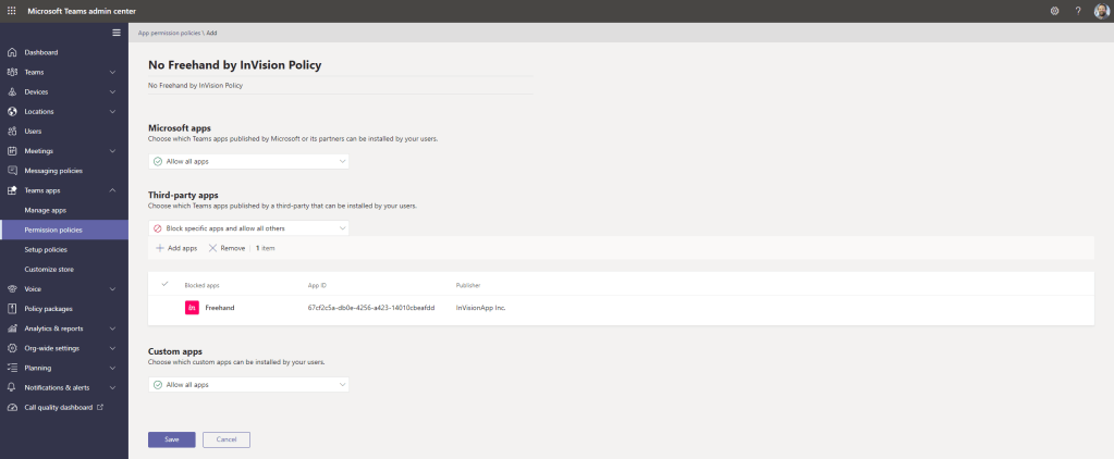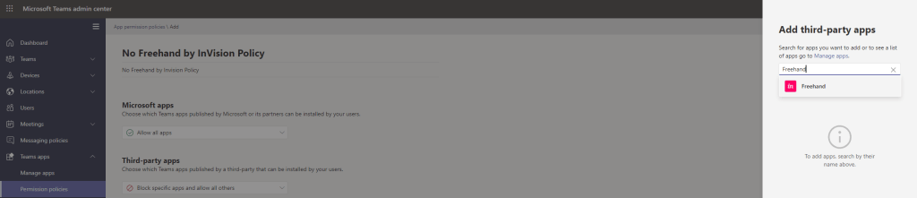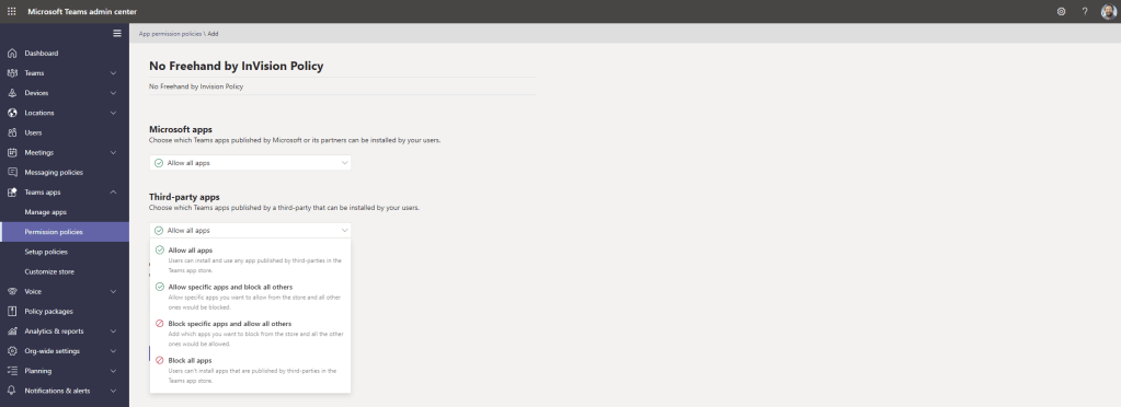 This is to not display Freehand for InVision in any meetings for some users within the organisation. Some could be using the app, and others not. You may want to remove it gradually, such as investigate if each department or user has used it before simply removing the functionality. For whatever reason, we can’t simply switch it off. In this scenario we would use an App Permission Policy. To note, an app permission policy will block specific users from using the app in any context – in meetings or in channels. You can’t have it so you can simply hide the app in meetings and yet still use it collaboratively elsewhere