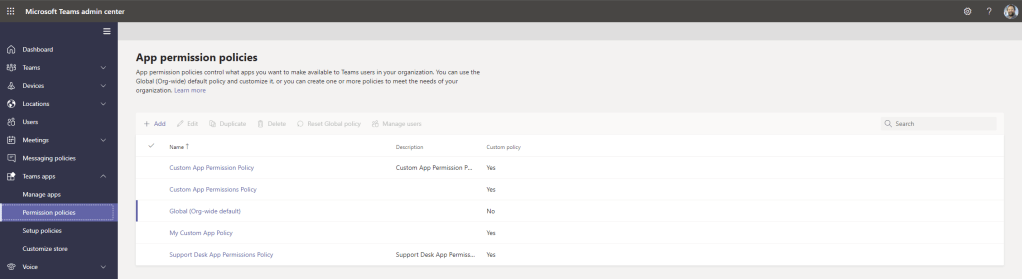 1.) In the Teams Admin Centre, select Teams Apps and then Permission Policies