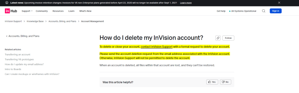 Having tested personally by creating an InVision account using the test tenant’s user’s credentials, it’s not easy to delete an InVision account once created: the user has to contact InVision support to delete it as it’s their policy they do not auto-purge unused accounts. However, users can log into their account and delete their data. The choice is yours on the deprovisioning strategy – and it remains to be seen whether InVision would delete all accounts linked to a domain upon an admin’s request – however my personal opinion here is that prevention is better than cure in this case and the app ought to be disabled or app permission policies applied before users get the opportunity to light it up.