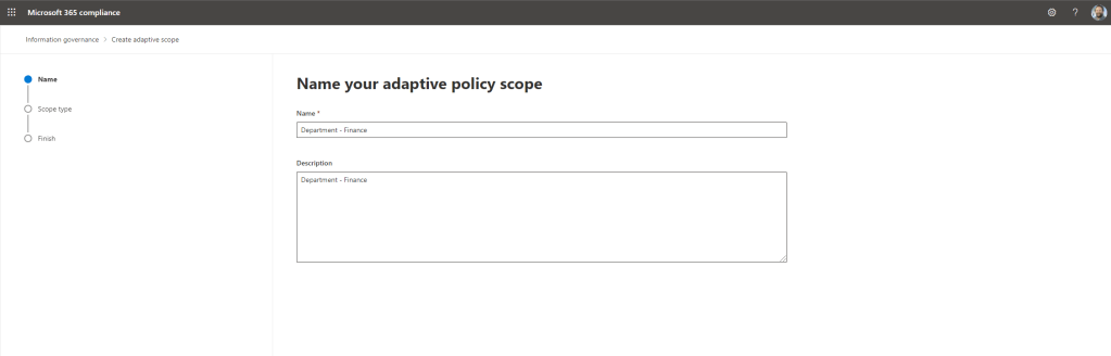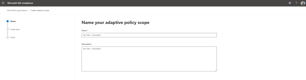 10.) Add a Name and Description for your scope. It’s recommended here to make the naming conventions very explicit so its clear in a list should there be several scopes. The scope cannot be renamed once created. Once done select Next