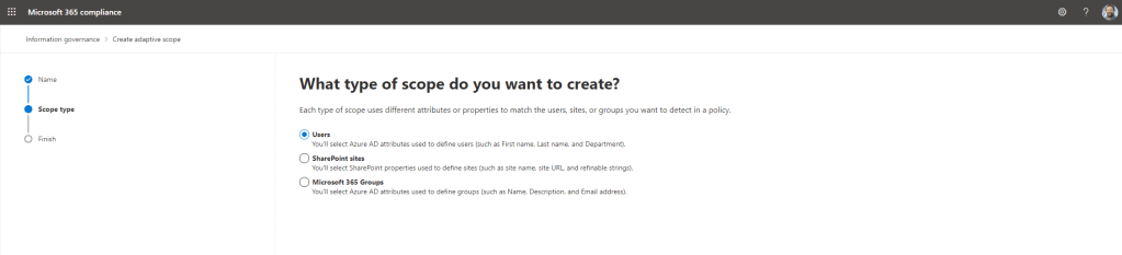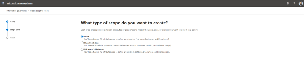 11.) Since this example will be an adaptive scope based on Department – and hence user based – select Users then Next