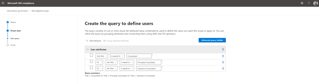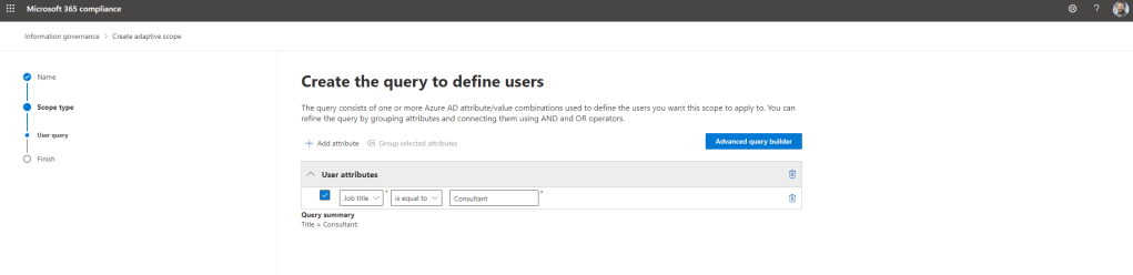 14.) Now is the time to set the attribute itself. There are a number of attributes to use, however this example uses Job Title so it has been set as that. Other examples include First Name, Last Name, Country and even custom attributes. This is set as shown so that the job title is equal (which again other options can be chosen) to Consultant (added manually) which is the job title of several users in Azure AD. Anyone with this job title in the organisation will go on to have the retention policy applied when the policy is created. Note, that a limitation here is that the operator only uses equal/not equal and starts with/does not start with. It would be awesome later on it could have ‘contains’ as many roles have similar words in their title – think here Chief, Consultant, Architect, etc., however there is a way to include multiple job titles – see FAQ’s. Once done select Next