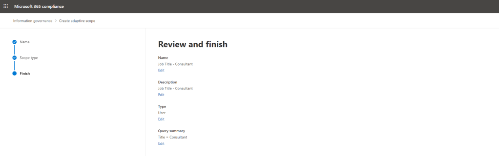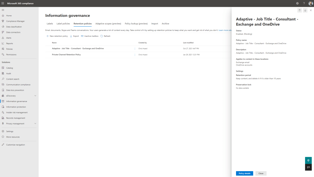 So we can see the benefits clearly. Powerful targeting of retention and label policies. You can also include Teams and Yammer in the same policies whereas with static, per docs, you can’t. Yet even before we look at this, we already know a few things which an we’ll need to go into it with our eyes wide open. The first is that Azure AD will need to be kept clean and up to date. For example, if I am basing a retention policy on an Azure AD attribute for users such as a role or department this may involve a bit of upfront tidying of Azure AD, and it will certainly need maintenance. Miss out a users attribute in Azure AD and they won’t be added to the policy. Static scopes may therefore be more beneficial as catchalls where keeping Azure AD up to date is low on the agenda, user onboarding is generally weak or, for example, IT within the org are not notified of role changes. Secondly, adaptive scopes are more granular which means they could make the retention landscape more complex and management overhead higher. Imagine you have several retention policies in play and several adaptive and static scopes. For any individual user, what retention actually applies? Whilst Microsoft have included a policy lookup tool in the compliance centre which you can query it will be interesting to hear how that goes in real world situations. Organisations who want a simple life will probably veer away from adaptive scopes. Lastly, since this is a preview feature at the time of writing their is little on licencing. The test tenant I use has Microsoft 365 E5 licencing, so it may well be an added cost. Like you I hope not. Also at the time adaptive doesn’t cover exchange public folders or preservation lock so if you want these things you’ll need to use static