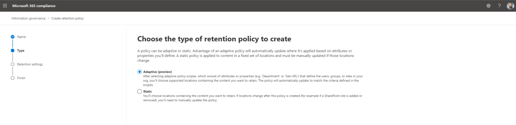 17.) Our users are set in Azure AD. The adaptive scope is built. Now for the policy. Select Retention Policies